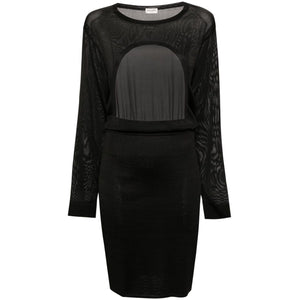 black knitted construction semi-sheer construction boat neck open back drop shoulder long wide sleeves elasticated waistband fitted waistline pencil silhouette straight mid-length hem Open-back knitted dress Size and Fit - This piece fits true to size. We recommend you get your regular size. Model is 1,75m / 5ft 8in wearing size S