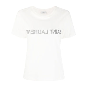 Reverse logo-print T-shirt from SAINT LAURENT featuring white/black, cotton, short sleeves, round neck, straight hem and internal printed logo. Logo cotton t-shirt Size and Fit - This piece fits true to size. We recommend you get your regular size. Model is 1,75m / 5ft 8in wearing size S