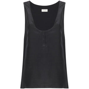dark grey silk satin finish Henley neck front button placket sleeveless straight hem We've partnered with Good On You — an independent agency that rates how brands perform in relation to their impact on the planet, people and animals, with a multi-criteria rating simplified to a five points scale. In order to be awarded our conscious label, larger brands need to score a minimum of four out of five ('Good'), while smaller brands must score at least three out of five ('It's A Start'). This item comes from a brand rated three out of five ('It's A Start') by Good on You at the time it was added on FARFETCH. Please note, this is a brand-level rating and does not guarantee that this product is made with conscious materials. Learn more about what makes a product Conscious on our Conscious Criteria page Size and Fit - This piece fits true to size. We recommend you get your regular size. Model is 1,75m / 5ft 8in wearing size 36 (FR)