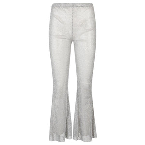 Silver trousers, leg leg, transparent, elasticized life. Flare leg trousers Size and Fit - This piece fits true to size. We recommend you get your regular size. Model is 1,75m / 5ft 8in wearing size S