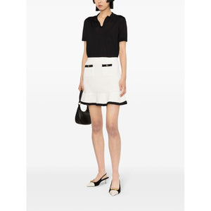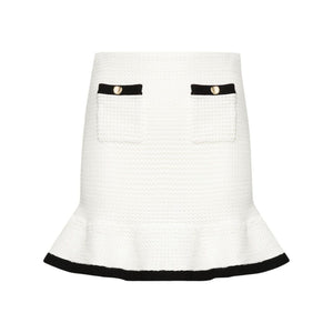 white/black crochet knit sequin embellishment contrasting ribbed trim elasticated waistband slim cut two front patch pockets peplum hem thigh-length mesh lining Crochet mini skirt Size and Fit - This piece fits true to size. We recommend you get your regular size. Model is 1,75m / 5ft 8in wearing size S