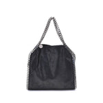 Stella McCartney’s Falabella mini Tote Handbag is a cruelty-free style icon, recognizable by its distinctive chain details. It features a silver-tone chain shoulder strap and handles, defining its unique, shiny silhouette. The magnetic flap closure ensures convenience and security. The interior, lined with the brand’s logo, includes a convenient open branded pocket, perfect for essentials. A round silver brand logo pendant completes the design, adding a final touch of recognition and sophistication.