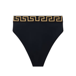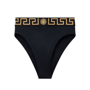 black stretch-design high-waisted Medusa Head motif elasticated logo waistband Be mindful to try on swimwear over your own garments. Greca high waist bikini bottom Size and Fit - This piece fits true to size. We recommend you get your regular size. Model is 1,75m / 5ft 8in wearing size 1 (NUM)