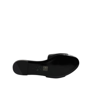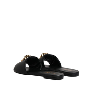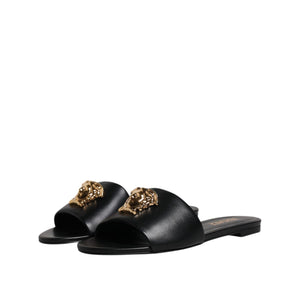 Versace Black Leather Logo Plaque Slip On Slides Flats Shoes
