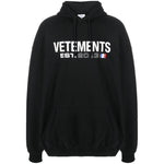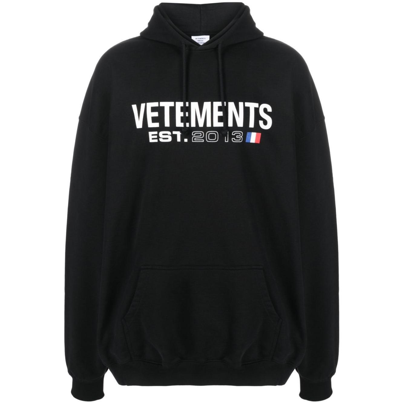 logo-print hoodie from VETEMENTS featuring black/white, cotton blend, logo print to the front, drop shoulder, drawstring hood, front pouch pocket, long sleeves, straight hem and ribbed cuffs and hem. Logo cotton hoodie Size and Fit - This piece fits true to size. We recommend you get your regular size. Model is 1,84m / 6ft 1in wearing size M