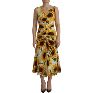 Dolce & Gabbana White Sunflower Print Sheath Midi Silk