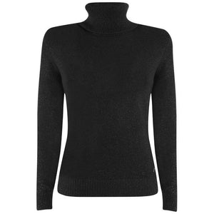 Yes Zee turtleneck sweater in soft stretch viscose blend yarn with lurex work, ribbed hems and cuffs, and logo tag at bottom